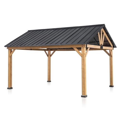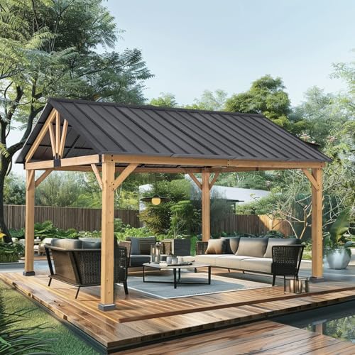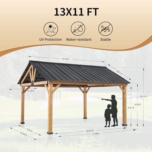 INTER HUT 11×13 Hardtop Gazebo, Galvanized Steel Gable Roof with Cedar Wood Frame Outdoor Pavilion for Patio, Garden, Deck and Lawn, Natural Wood/Black