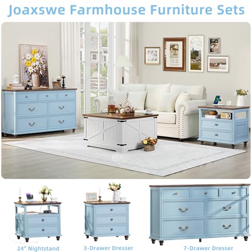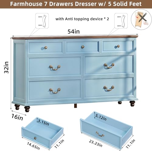 Joaxswe Farmhouse 54" 7 Drawers Dresser for Bedroom, Wide Wood Chest of Drawers w/ 4 Wooden Legs, Vintage Large Storage Dressers Organizer for Hallway, Rustic TV Stand for Living Room, Light Blue