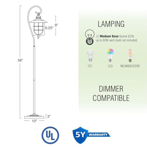 - FITS MANY DECOR STYLES WITH UNMATCHED WARRANTY: This industrial lantern floor lamp with a brushed pewter finish complements many decor styles from mid century and farmhouse, to contemporary and modern designs. Enjoy peace of mind with our 5-year warranty, guaranteeing your complete satisfaction.