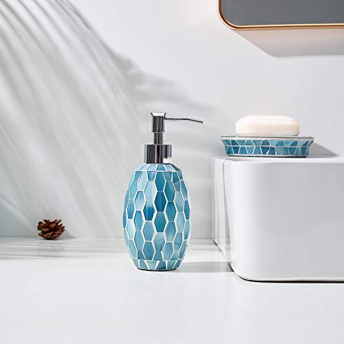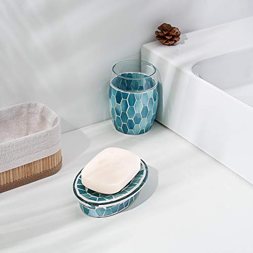 4PCs Mosaic Blue Glass Bathroom Accessories Set with Decorative Pressed Pattern – Includes Hand Soap Dispenser & Tumbler & Soap Dish & Toothbrush Holder (Blue)