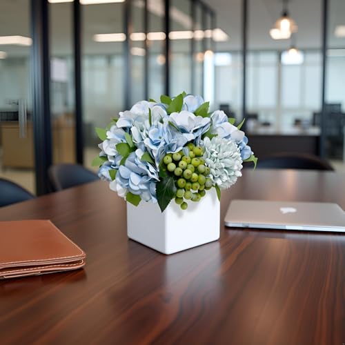 - ELEGANT DESIGN: Stunning artificial hydrangea arrangement featuring light blue blooms and green berries in a sleek white ceramic vase, perfect for modern home decor