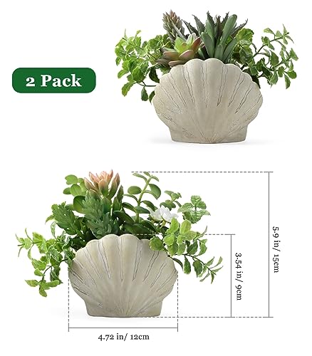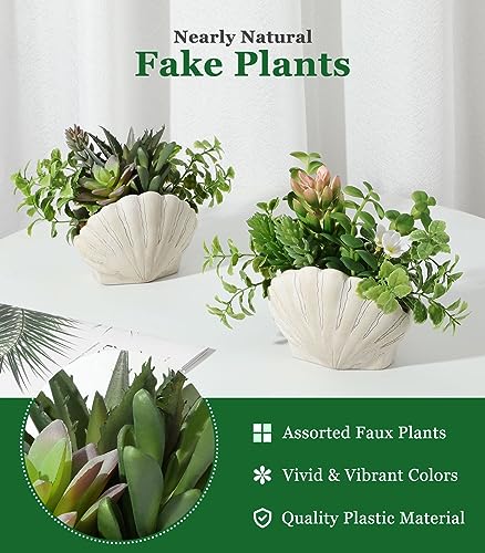 Lewondr Fake Plants Set of 2, Assorted Faux Succulents Artificial Plants with Sea Shell Pots, Artificial Greenery in Coastal Beach Decor, Ocean Seashell Series for Home Bedroom Beach Theme Party