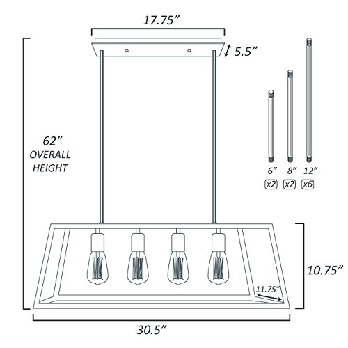 - ADJUSTABLE HEIGHT: 50"H fully adjustable rod length (includes six 12", two 8" and two 6" rods to allow a variety of hanging heights). This pendant is hardwired, installation required