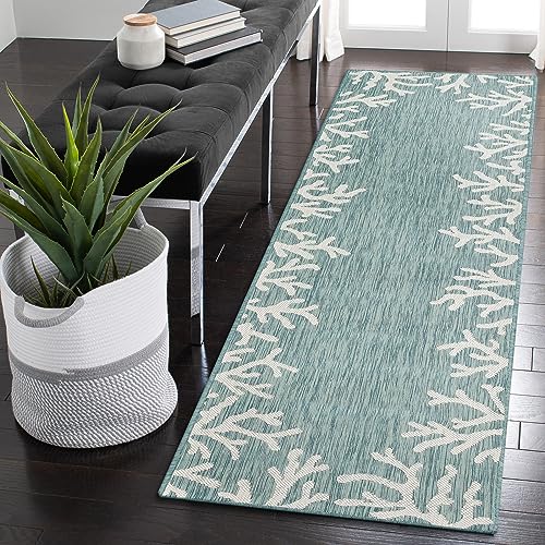 Liora Manne Carmel Indoor/Outdoor Power Loomed Synthetic Blend Low Profile Area Rug – Transitional Border Coastal Ocean Decorative (Coral Border Aqua) (1'11" x 7'6")