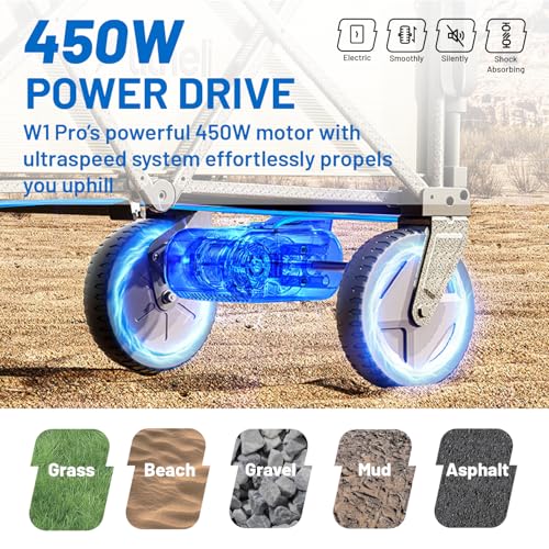 - 【Effortless Power Drive – Say Goodbye to Heavy Lifting】 Equipped with a robust 450W motor, this electric camping wagon effortlessly climbs slopes and tackles heavy loads—just press the button and let it roll. Whether you're heading uphill to a campsite or across sandy beaches, the powerful motor does the work for you.