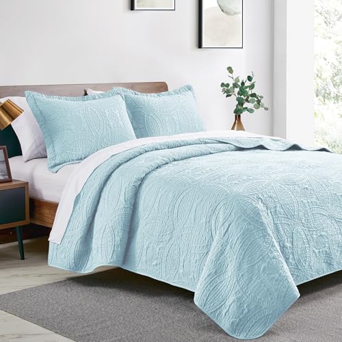 Love's cabin King Size Quilt Set Spa-Blue Bedspreads – Soft Bed Summer Lightweight Bedspread Comforter – Modern Style Coin Pattern Coverlet for All Season – 3 Pieces (1 Quilt, 2 Pillow Shams)