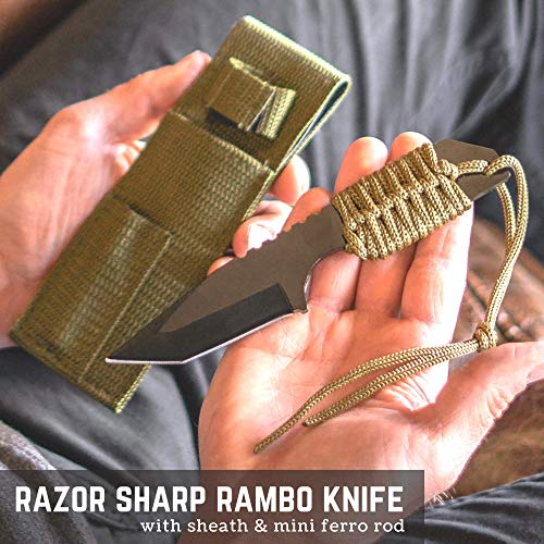- The fire-starting enthusiast will love the thrill of starting a camp fire with the primitive Fire Starting Kit – a Ferro Rod & Tinder Rope. The Rambo Knife is the perfect companion for the adventurer, with its razor-sharp steel blade that easily cuts through tough materials.
