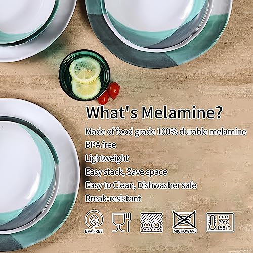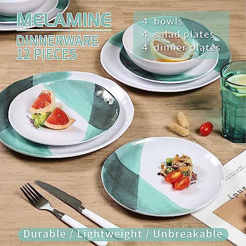 Melamine Dinnerware Set – 12piece Plates and Bowls Set, Dishwasher safe, Out and Indoor use,White&Green