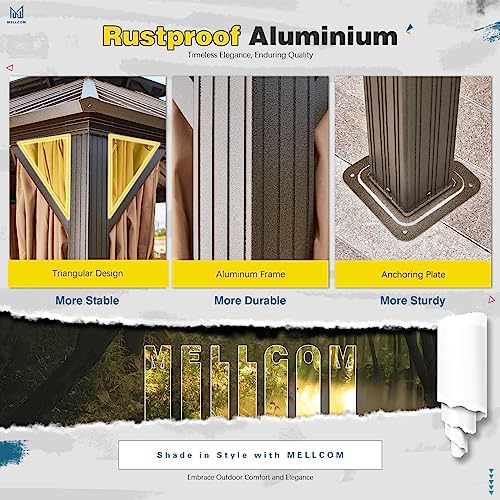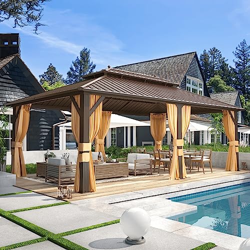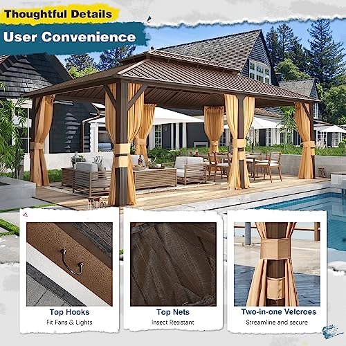 MELLCOM 12'x20' Hardtop Gazebo, Metal Double Roof Aluminum Gazebos with Curtain and Netting,Brown Permanent Galvanized Steel Pavilion for Patio, Lawn & Deck