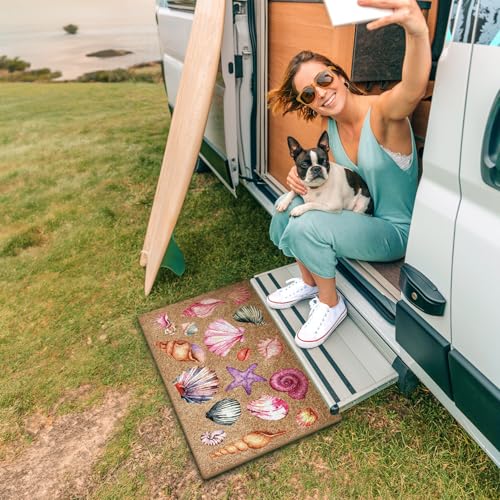 Mingnei Coastal Preppy Beach Coco Coir Doormat Door Mat for Home House Entrance, Ocean Coastal Beach Pink Seashell Conch Floor Mats for Outdoor Outside Entryway 30×17 Welcome Mat