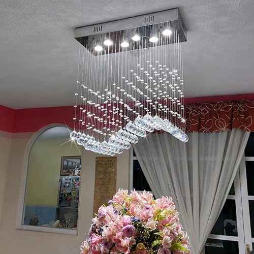 Modern Wave Chandelier, Rectangular Crystal Raindrop Chandelier Flush Mount Pendant Lighting Chrome Ceiling Light Fixture for Dining, Living Room, Kitchen Island, Bedroom of CRYSTOP