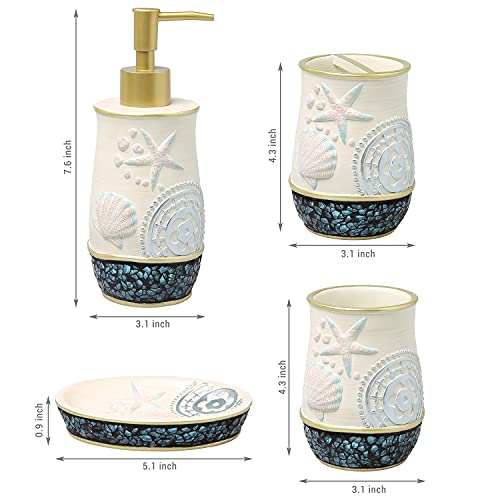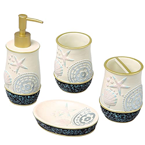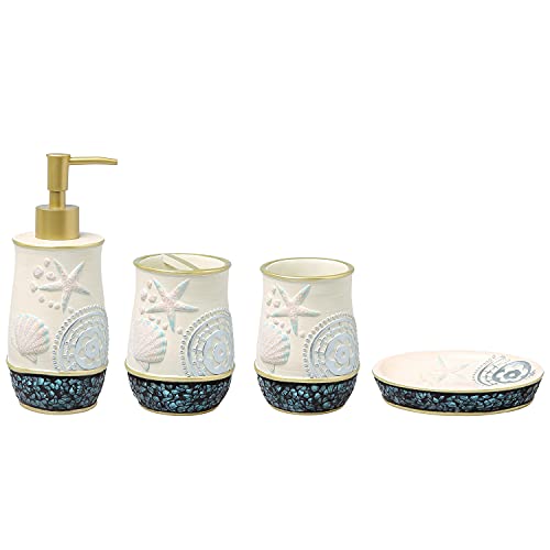 4 piece seashell and starfish embossed bathroom accessories set includes liquid soap/lotion dispenser, toothbrush holder, tumbler cup, and soap dish