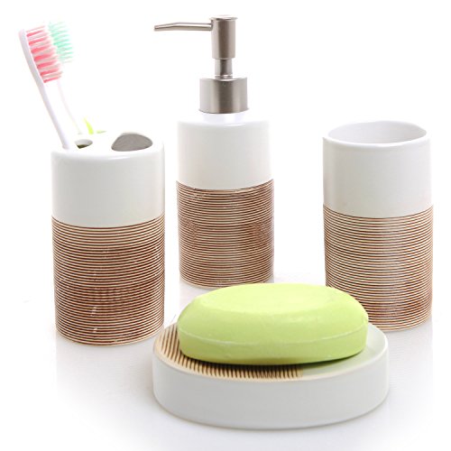 MyGift Deluxe 4 Piece Dual Tone White with Clay Stripe Ceramic Bathroom Accessories Set, Includes Soap Dish, Pump Dispenser, Tumbler Cup, and Toothbrush Holder