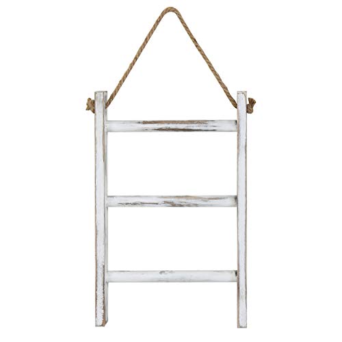 MyGift Rustic Hand Towel Holder, Whitewashed Solid Wood Farmhouse Bathroom Decor, Small Blanket Ladder for Home Decor, Wall Mounted Towel Rack for Shabby Chic Decor