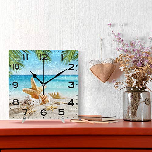 Naanle 3D Tropical Seashells Starfish on Summer Beach Sand Silent Square Wall Clock, 8 Inch Battery Operated Quartz Analog Quiet Desk Clock for Home,Office,School