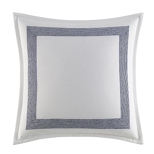 - DESIGN: Highlighting a combination of printed textural stripes in shades of blue accented with bands of white and grey. Reversing to a solid deep blue textured ground. Square pillow is a solid white ground accented with navy embroideries. Breakfast pillow is designed using a crisp white ground with white embroideries for a tonal effect.