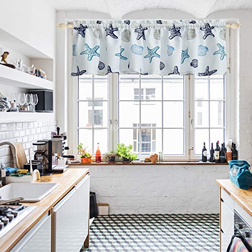 - 【starfish valances for windows】 Sold individually. Each package includes 1 panel blue starfish kitchen valance, measuring W54 x L15 inches. 2"Rod pocket (1.27" diameter) fits easily with standard curtain rods.