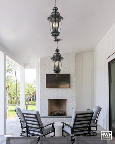 Outdoor Pendant Lights for Porch, HWH 26'' Large Exterior Hanging Light Fixtures with Seeded Glass, Outdoor Hanging Chandelier for Porch Patio Gazebo Hallway, Matte Black Finish, 5HW90H-L BK