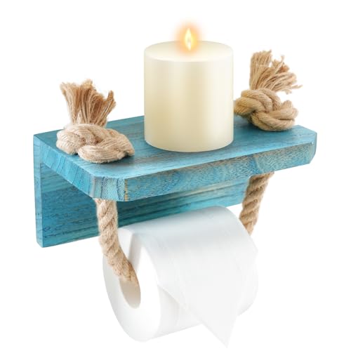 Perfeso.L Nautical Rope Toilet Paper Holder–Blue Farmhouse Bathroom Decor Beach Rope Starfish Coastal Towel Holder Wall Mount–Towel Rack Unique Rustic Tissue Roll Holder with Wood Shelf