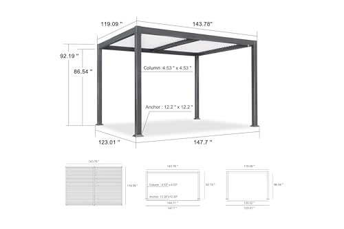 - Durable Construction: Constructed from premium aluminum, this outdoor pergola is corrosion-resistant and stands the test of time. When anchored with expansion screws to a solid surface, it can withstand winds up to 65 mph.