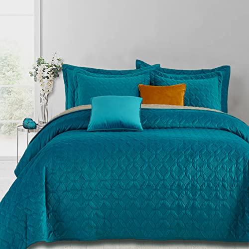- Premium Velvet Super Soft – 4 pieces teal blue velvet quilt king size is crafted from our high quality velvet – smooth surface and dense piles providing velvety and cozy touch. Reversiable – The embroidered teal quilt & king shams reverse to brushed microfiber in Beige to provide a reversiable option and an elegent folded top.