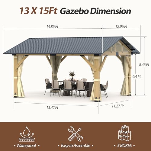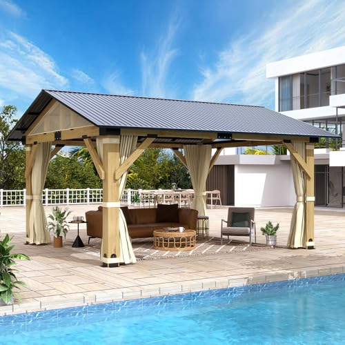 Raysfung 13' x 15' Wood Gazebo, Outdoor Hardtop Gazebo with Netting and Curtains, Cedar Wooden Frame Gazebos with Galvanized Steel Roof for Garden, Patio, Deck