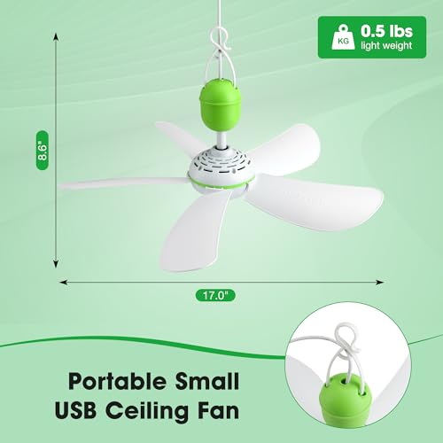 Roodike 17" Portable USB Ceiling Fan for Camping Tent Outdoor Gazebo RV, 13.2 Ft Long Cord with on/off Button