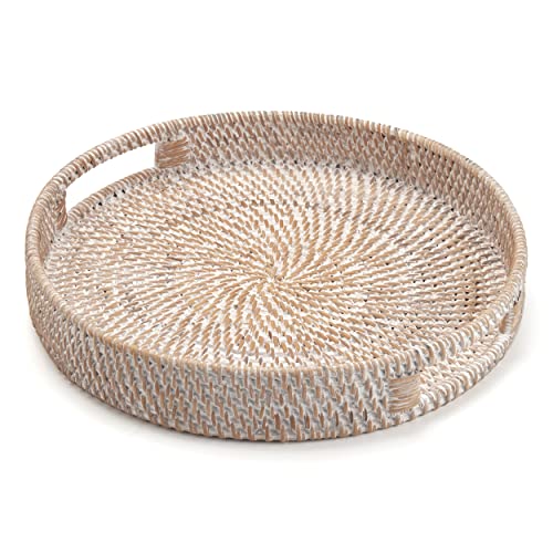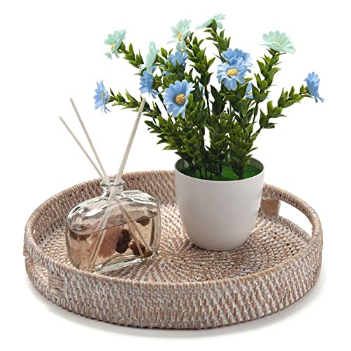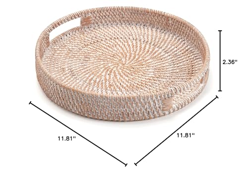 Round Rattan Serving Tray Decorative Woven Ottoman Trays with Handles for Coffee Table White (Small 11.8 inch x 2.4 inch)