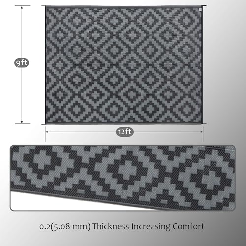 SAND MINE Waterproof Outdoor Rug 9×12 ft, Plastic Reversible Rug, Modern Area Rug, Large Floor Mat for Outdoors, RV, Patio, Backyard, Deck, Picnic, Beach, Camping, Black Grey Lattice
