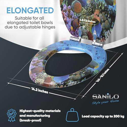 SANILO Wooden Toilet Seat with Soft Close [ELONGATED] – Decorative, Quiet & Slow Close Molded Wood Seat – With Strong Bumpers & Hinges – Adjustable Fit – Ocean