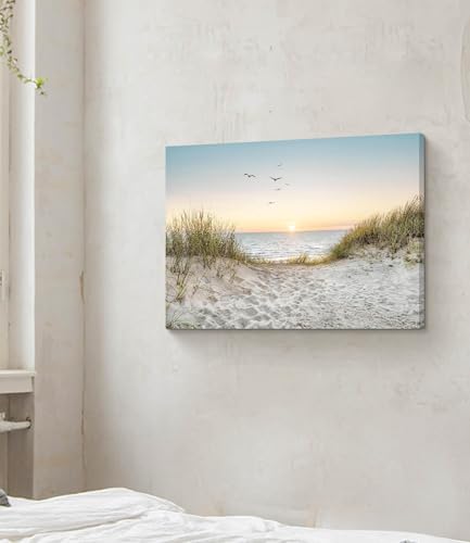 - Product: The theme of this coastal beach seascape painting artwork is beach during the sunrise, seabirds soar over the sea with the rising sun. The ocean beach picture canvas wall art size is horizontal 36”x24”. The seaside beach scenery picture prints wall decor helps to make your spaces more lively and brings a coastal vibe to living room, bedroom, kitchen, dining room, hallway or office
