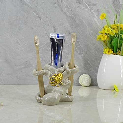 5-inch Gold Octopus Toothbrush Holder – Resin Bathroom Organizer with Mother & Baby Design, Nautical Theme Decor & Suction Cup Base