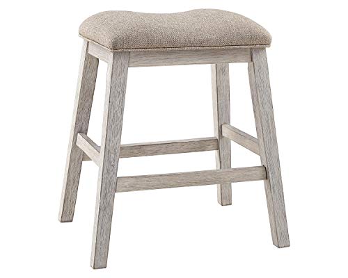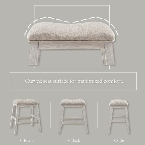 - UPHOLSTERED COUNTER STOOL: This upholstered stool invites you to raise the bar on small space living. Comfortably cushioned stools sport a grayish white finish with rub-through effect for timeworn appeal