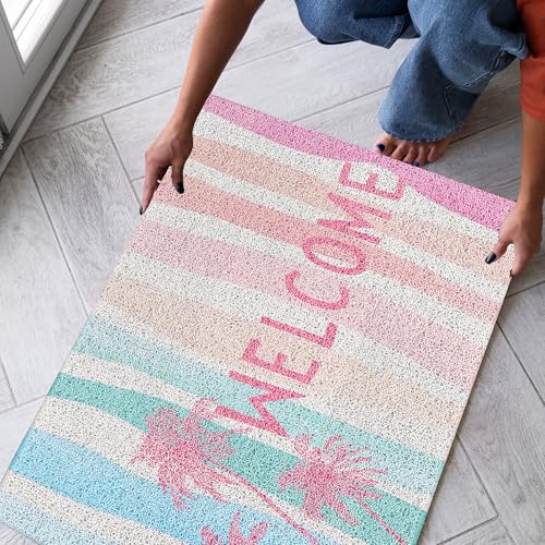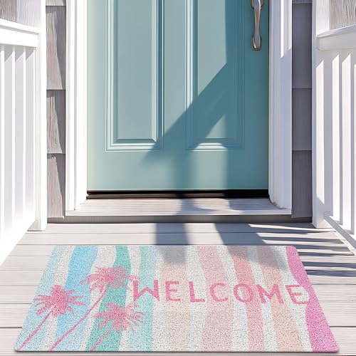 SNNDER Beach Welcome Mat, Pastel Colorful Coastal Palm Tree Preppy Beach Doormat for Front Door Porch Outdoor Outside Entrance, Beachy Doormat, Ocean Bath Mats, 17×30 Inch