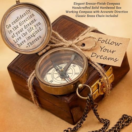 - Elegant & Inspirational Design – This antique brass compass is corrosion-resistant and comes in a hand-stitched imprinted rosewood storage case. It features an engraved quote from Thoreau: “Go Confidently in the Direction of Your Dreams! Live the Life You've Imagined.”
