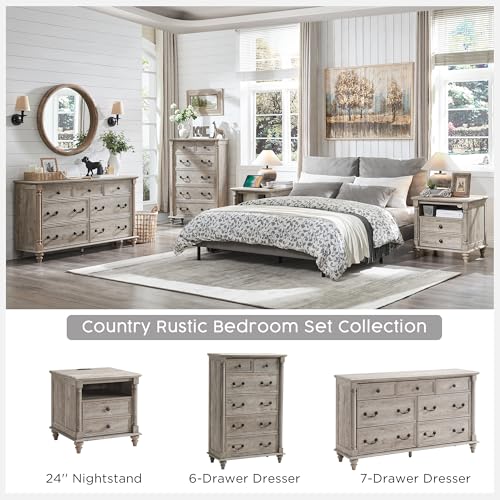 - EXQUISITELY CRAFTED: Measuring 24''W* 24'' D *24'' H. With a replicated light rustic wood grain that stands out against the distressed finish, this transitional nightstand brings a warm presence to your bedroom/living room. Beautified with 4 solid wood feet & and the solid wood column decor which is wonderfully easy on the eyes. Paired with the unique antique-tone pulls and recessed 4-in-i charging station on the tabletop, made for years of satisfaction.