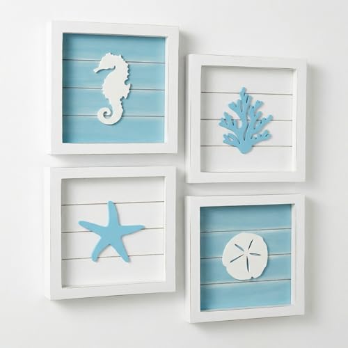 - 3D Wooden Decoration – This charming set is made entirely of wood and includes 4 wooden frames 7" x 7" each featuring delicate 3-D Marine Life shapes of sea horse, coral, sand dollar and a starfish. Perfect set for any ocean theme interior.