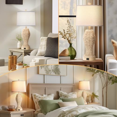 - 【Hand-knitted Woven Table Lamps】These Farmhouse rattan table lamps will not only light up your room, but also decorate your house. Our rattan lamps set of 2 are made of seagrass by experienced craftsmen, so each tall usb table lamps is a unique craft that perfectly blends nature with the home. The gourd shape body is wrapped with dried seagrass and equipped with trapezoid cream lampshades. Perfect for various styles of furniture, such as coastal, boho, farmhouse, seaside, natural style