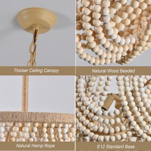 - [Perfect Design]The boho beaded chandelier is finished with a original wood color of natural wooden bead hanging curtain look and vintage hand-work woven hemp rope trim circle,the hanging hardware is strong and safe,the chain is adjustable.Perfect design for a boho,rustic, retro, classic style,beautiful amazing large chandelier and great quality that brings an eye-catching focal point to the house also that wood beads have coastal beach look,it would be the excellent centerpiece of a room.