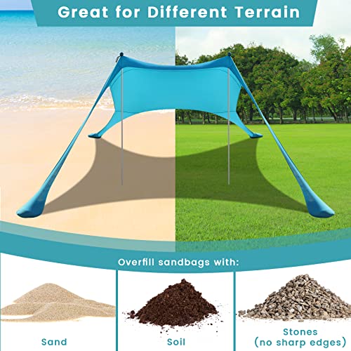 - MORE STABLE FRAME STRUCTURE: In addition to 4 refillable sandbags & ground stakes to make this beach tent more stable, each beach canopy has an extra anti-wind rope in the reinforced pole, which makes the beach shade with better wind resistance. All in all, do not worry about the beach tent blowing away when playing