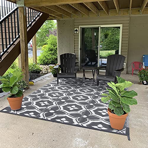 Vaukki Reversible Rug, Plastic Straw Outdoor Mat Fade Resistant Plastic Outdoor Patio Mat, Lightweight Ocean Area Carpet for Patio, RV, Camping, Deck, Backyard and Picnic (Grey and White, 4'x6')