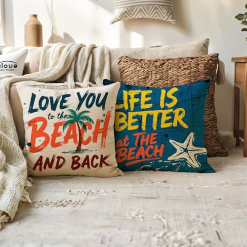 Coastal Beach Throw Pillow Covers 4Pack Ocean Nautical Design with Quotes and Palm Trees Decorative Pillowcases Summer Beach House Cushion Covers 18×18 inch for Coastal Home Decor(Multi)