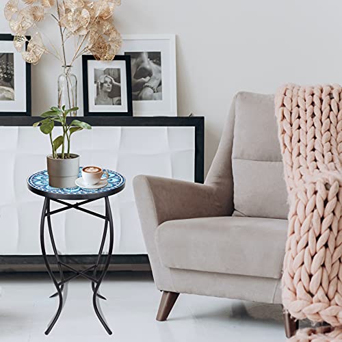 Vipush Outdoor Mosaic Side Table,14'' Round Small Patio Bistro Accent Table Indoor End Table Black Iron Plant Stand for Garden Yard Parch Balcony,Dark Blue