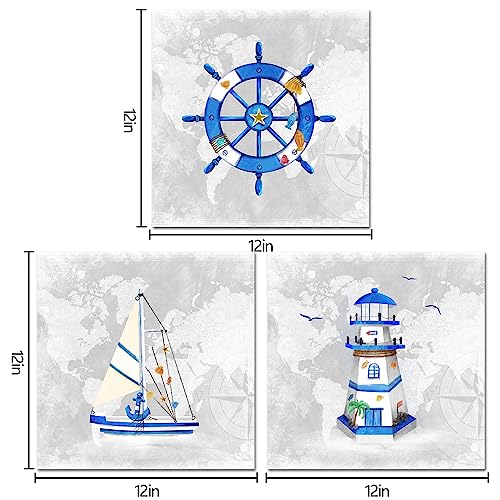 - VVOVV Wall Decor Blue and Grey Coastal Wall Art Lighthouse Sailboat Painting Picture Prints Nautical Bathroom Wall Decor Framed 12"x12"x3 Pieces