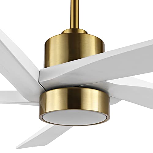 WINGBO 54 Inch DC Ceiling Fan with Lights and Remote Control, 5 Reversible Carved Wood Blades, 6-Speed DC Motor, Modern Ceiling Fan in Brass Finish with White Blades, ETL Listed