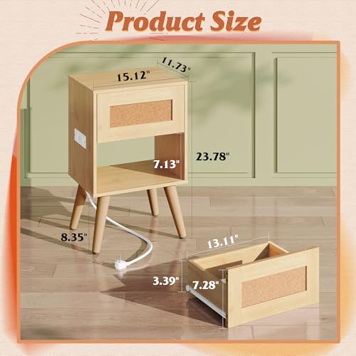 WLIVE Rattan Nightstand with Charging Station, Boho Night Stand, Small Bedroom Side Table, End Table with Drawer and Storage, Wood Bedside Tables for Bedroom, Small Spaces, Natural Oak