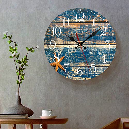 - ArtSocket Wooden Wall Clock Silent Non-Ticking, Wooden Starfish Beach Wood Vintage Dark Blue Round Wall Clocks Decor for Home Kitchen Living Room Office, Battery Operated(12 Inch)