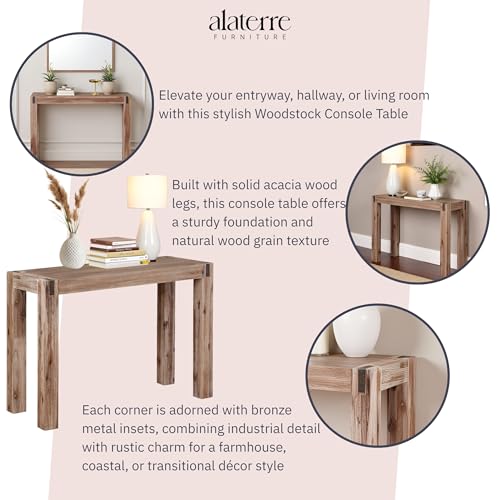 Alaterre Furniture Woodstock 40-Inch Console Table – Modern Farmhouse Entryway Table with Solid Acacia Wood Legs and Bronze Metal Corner Inset – Accent Table for Hallway or Living Room (Driftwood)