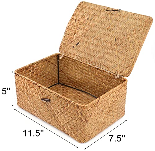 Yesland Handwoven Seagrass Rattan Storage Basket – 11.5'' x 7.5'' x 5'' – Brown Rectangular Makeup Organizer Container with Lid, Perfect for Decoration, Picnic, Groceries and Toy Storage