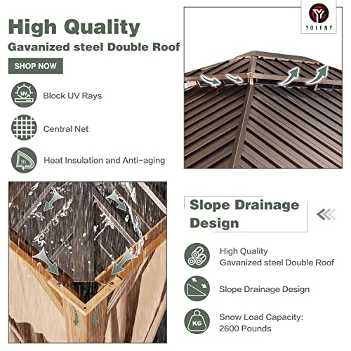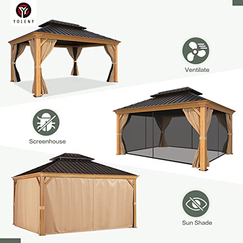 YOLENY 12' x 14' Hardtop Gazebo, Wooden Finish Coated Aluminum Frame Gazebo with Galvanized Steel Double Roof, Outdoor Permanent Metal Pavilion with Curtains and Nettings for Patio, Lawn & Garden